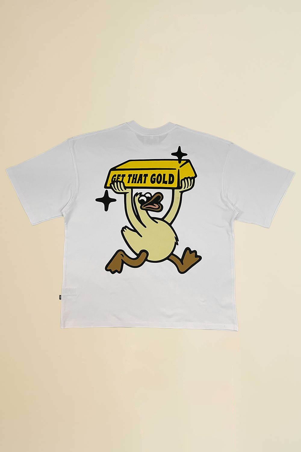 Get That Gold, baby! We’re all still settling into the new year, and some of us need a motivational mantra to help us get through it all. Let this be your sign to go out there and get it, whatever your proverbial gold might be. While you’re at it, you might as well inspire others to do the same. The T-Shirt features screenprints of a duck hoisting up a bar of gold on the back and our flagship store Duck Duck Goose’s wordmark logo on the front, both designed by Shaun Hill.